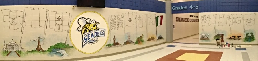 I had the pleasure to partner with Marvin B. Smith Elementary School for their Global Initiative. The purpose of the mural is to enhance the new global perspective of the school. Upper-level elementary students were able to participate in the process by painting portions of the various flags. The mural spans the main foyer entrance, approximately 7 feet high and 36 feet wide.